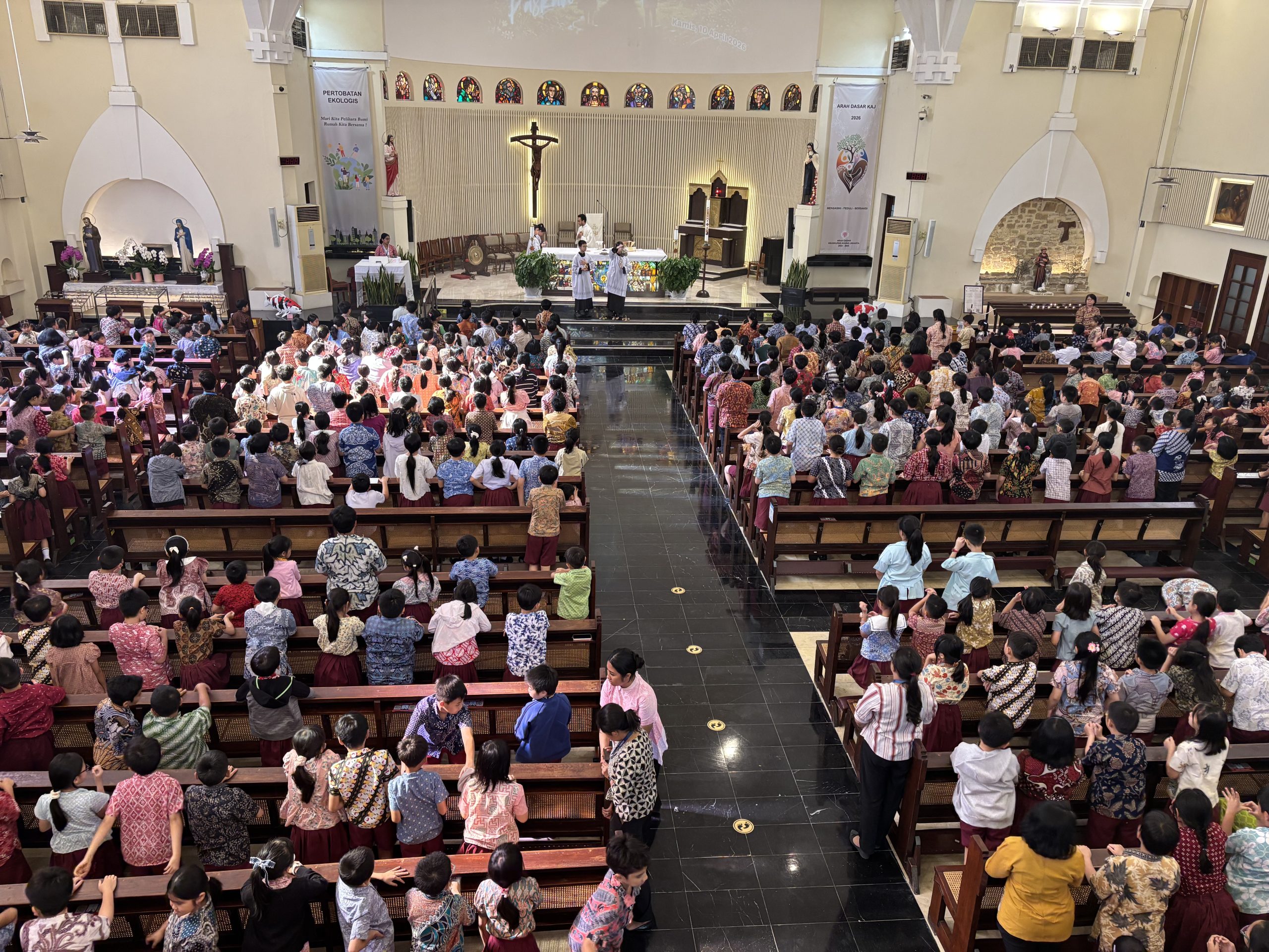 Perayaan Misa Paskah di sekolah telah dilaksanakan dengan penuh khidmat, sukacita, dan kebersamaan seluruh warga sekolah. Kegiatan ini menjadi momen istimewa untuk merayakan kebangkitan Yesus Kristus sebagai tanda kemenangan atas dosa dan maut, sekaligus membawa harapan serta kehidupan baru bagi umat beriman. Perayaan Ekaristi diikuti oleh peserta didik, guru, dan tenaga kependidikan dengan penuh antusias dan keterlibatan aktif. Dalam homili, disampaikan pesan tentang makna kebangkitan Kristus yang mengajak seluruh umat, khususnya peserta didik, untuk hidup dalam kasih, saling mengampuni, serta senantiasa berbuat baik dalam kehidupan sehari-hari, baik di lingkungan sekolah maupun di rumah. Selain itu, melalui doa bersama, nyanyian liturgi, serta partisipasi petugas dari para peserta didik, perayaan ini juga menjadi sarana pembinaan iman dan karakter. Nilai-nilai seperti kebersamaan, kepedulian, dan rasa syukur ditanamkan sejak dini agar semakin tumbuh dalam diri setiap peserta didik. Dengan terlaksananya kegiatan ini, diharapkan semangat Paskah tidak hanya dirasakan dalam perayaan, tetapi juga diwujudkan dalam tindakan nyata sehari-hari. Semoga kebangkitan Kristus senantiasa menginspirasi seluruh warga sekolah untuk hidup dalam iman, pengharapan, dan kasih, serta menjadi pribadi yang membawa terang dan kebaikan bagi sesama. Selamat merayakan Paskah. Tuhan memberkati.