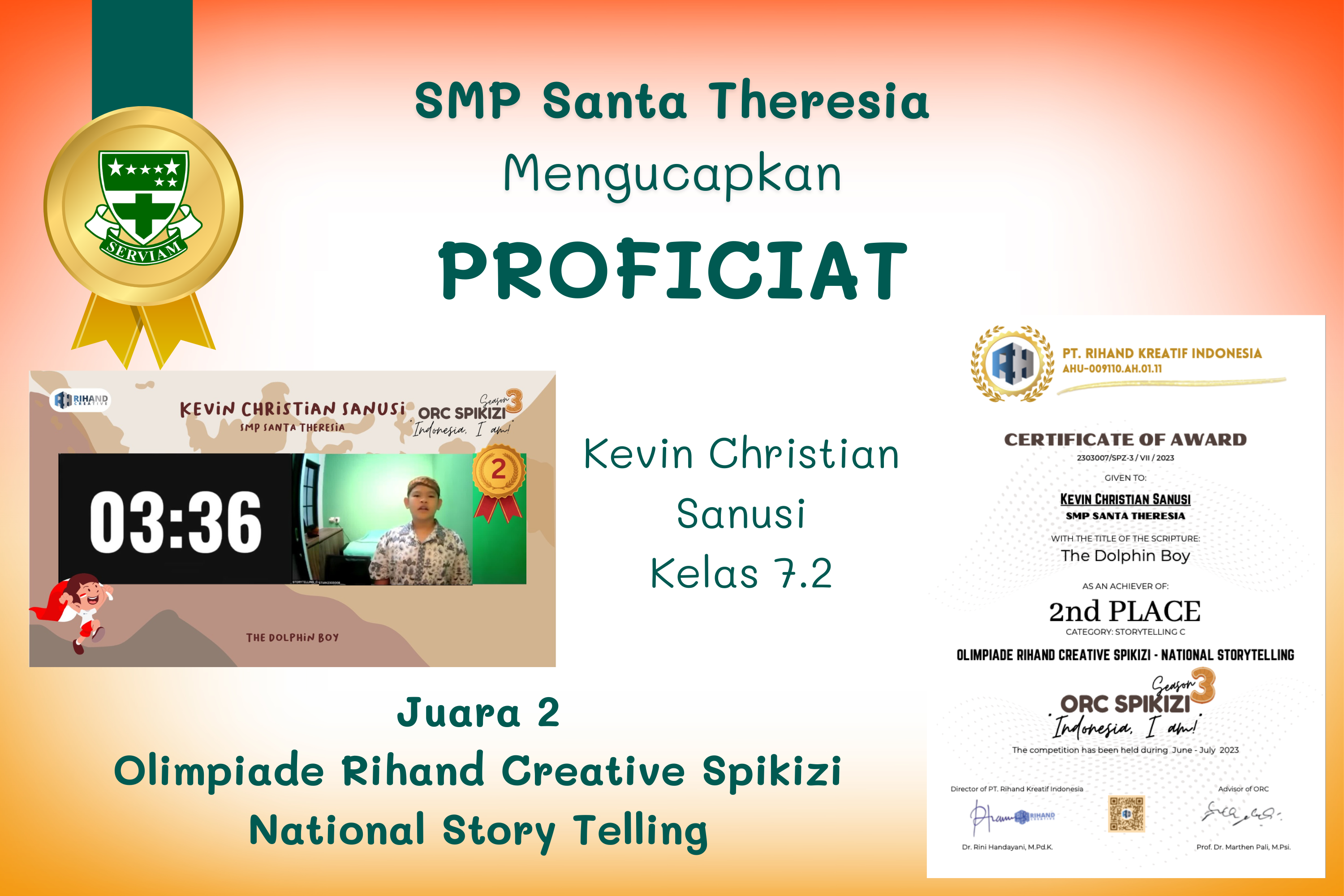 SMP Santa Theresia mengikuti lomba Story Telling dalam Olimpiade Rihand Creative Spikizi National Story Telling. Lomba ini diwakili oleh Kevin dari kelas 7.2.