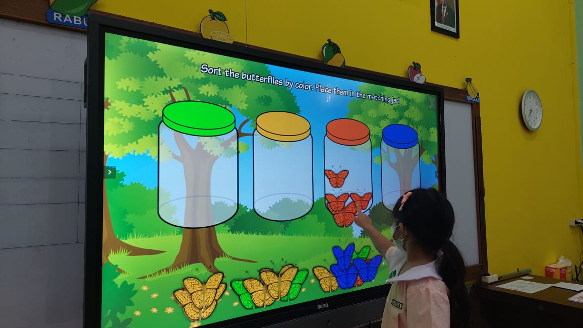 Ruang kelas KB yang nyaman dengan kapasitas 21 peserta didik dilengkapi dengan smartboard berukuran 65 inch, 2 buah AC, meja dan kursi yang didesain khusus serta berbagai macam alat permainan pendukung pembelajaran.